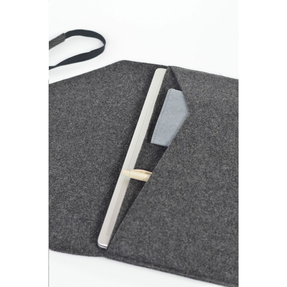 De sleeve is geschikt voor laptops met een maximale grootte van 14 inch. Het materiaal bestaat uit gerecycled wolvilt. De samenstelling is 50% gerecycled materiaal, 30% wol en 20% PE. De laptophoes heeft een extra opbergvak voor bijvoorbeeld een oplader of documenten. De sluiting bestaat uit een elastiek van katoen en natuurlijk rubber. De sleeve is een Nederlands ontwerp en handgemaakt in Nederland.