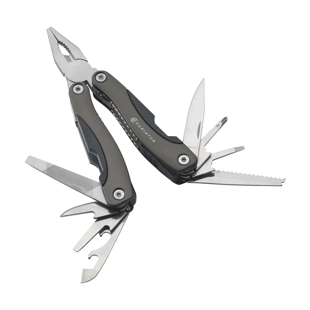 De MaxiTool is een compacte multitang van roestvrij staal met een aluminium handgreep. Dit gereedschap combineert dertien verschillende functies in één handzaam ontwerp. De handgreep heeft een metallic look voor een professionele uitstraling. Het product wordt geleverd inclusief een nylon etui en is verpakt in een kraft doos.
