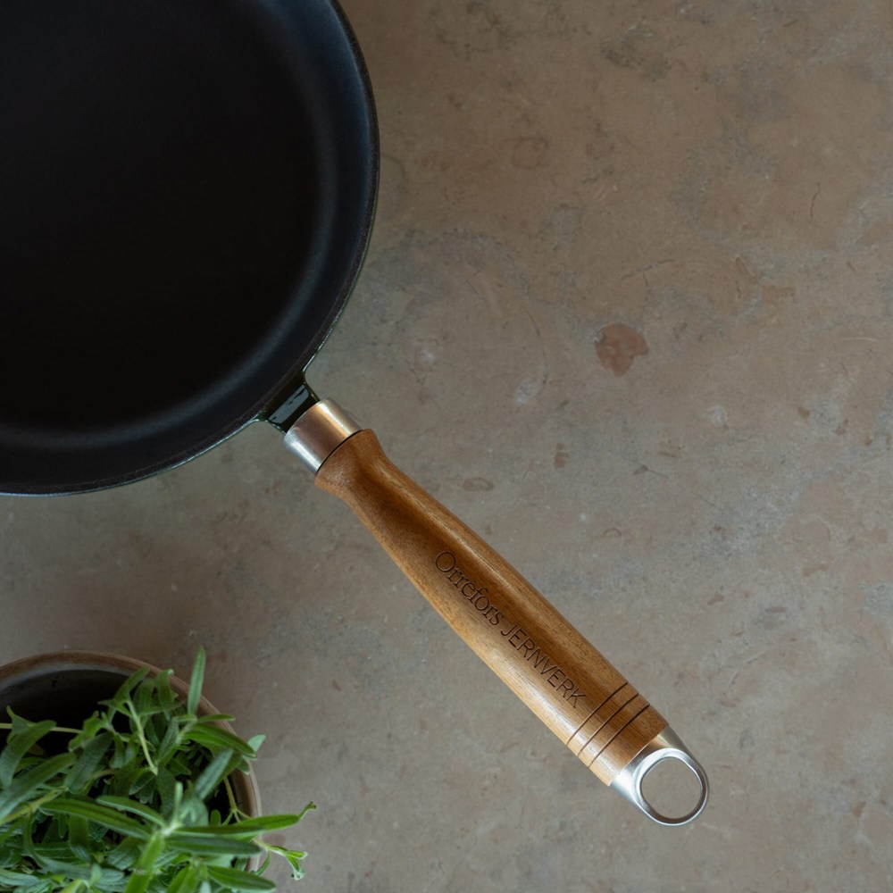 De pan heeft een diameter van 26.5 centimeter. Het materiaal is gietijzer van de Orrefors Jernverk-kwaliteit. De pan beschikt over een handvat van duurzaam acaciahout. Het handvat is afneembaar voor gebruik in de oven. De pan is geschikt voor inductie, gas, elektrisch en ovengebruik. Je kunt kiezen uit de kleuren Zwart, Rood en Donker-groen.