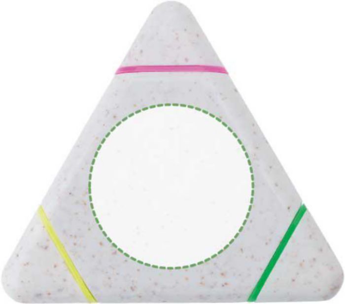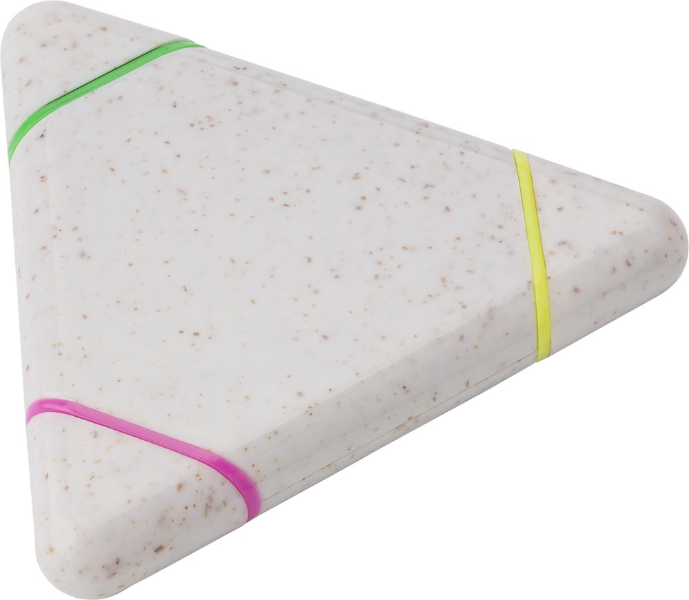 De driehoekige markeerstift set is een duurzaam promotiemiddel. Deze set combineert PP met tarwestro, een milieubewuste keuze. De markeerstift heeft een opvallend driehoekig ontwerp. Elke hoek van de set bevat een markeerstift in een andere kleur. Je ontvangt de kleuren roze, groen en geel. De markeerstift set is uitermate geschikt om te bedrukken met jouw bedrijfslogo.