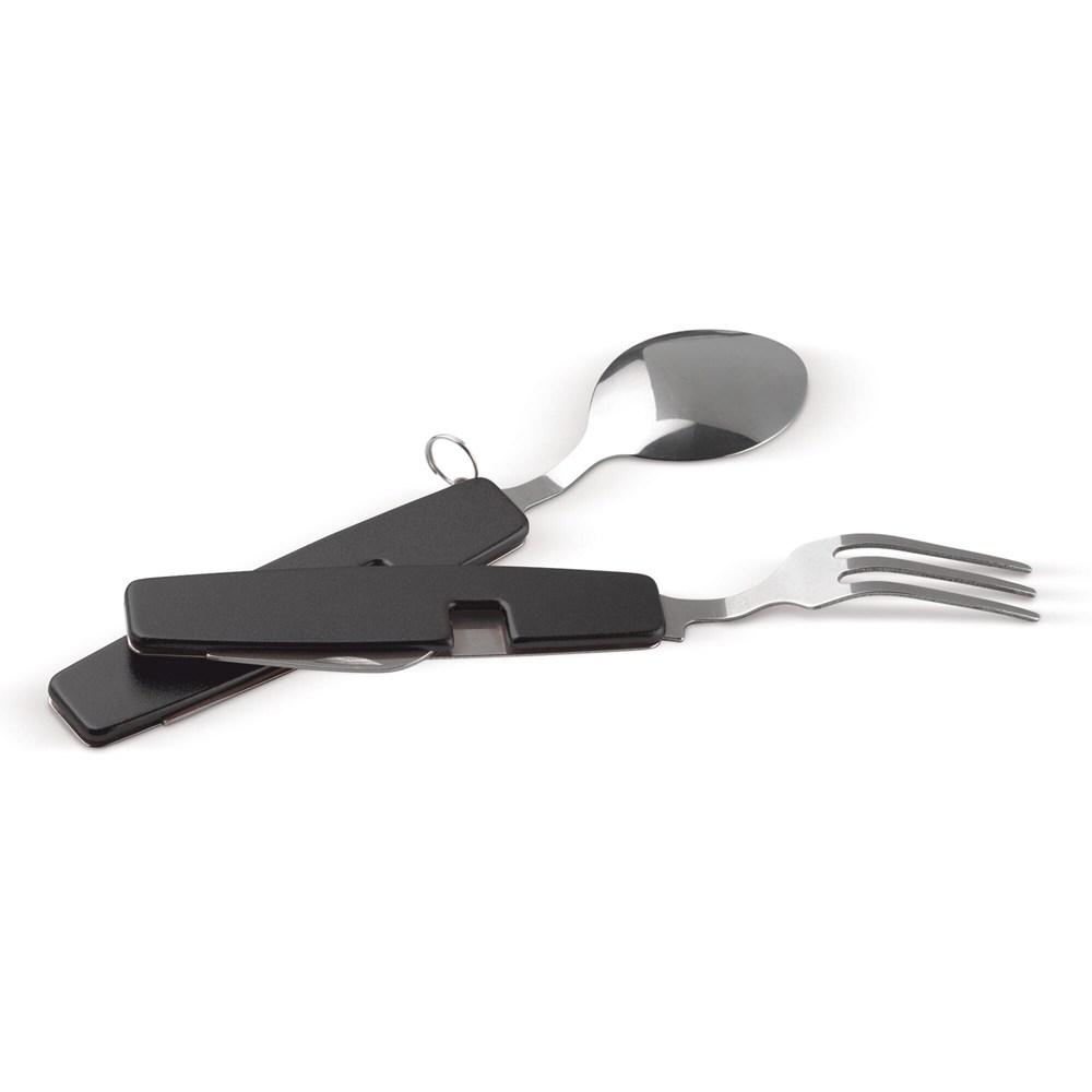 Het inklapbare bestek in multi-tool bevat een mes, een vork, een lepel en een flesopener. De set is ontworpen als één compacte tool. Het product is beschikbaar in meerdere kleuren. Het design is gericht op compactheid en gebruiksgemak. Dit is een variabel product.