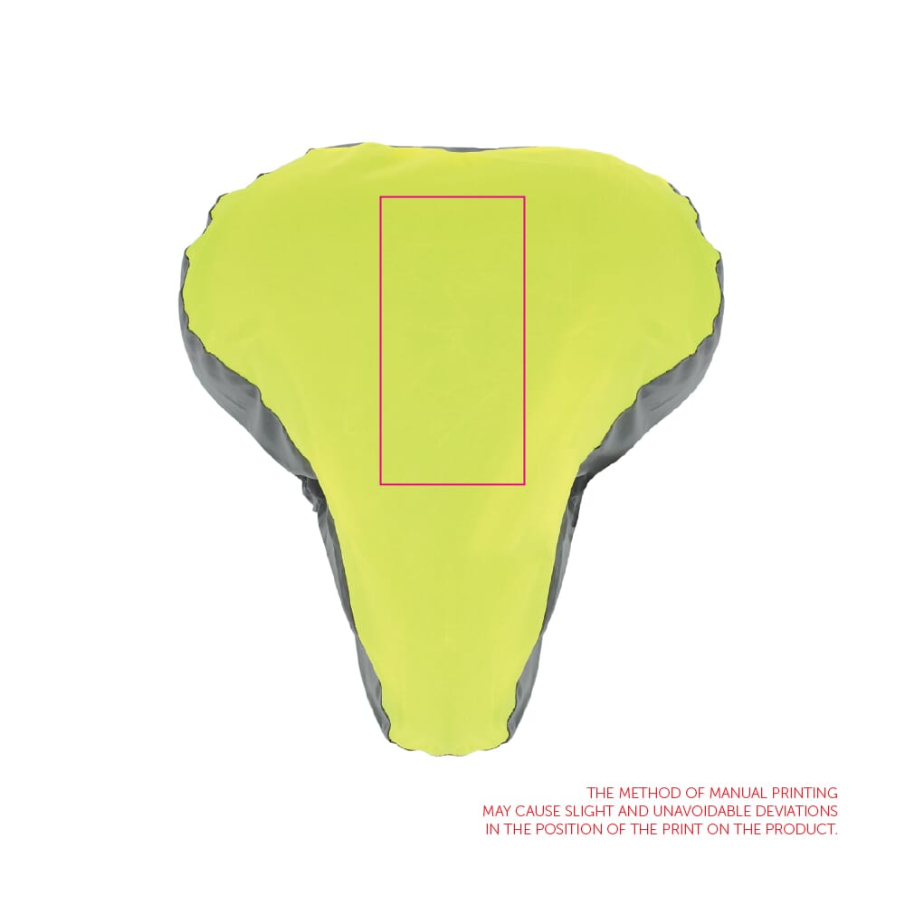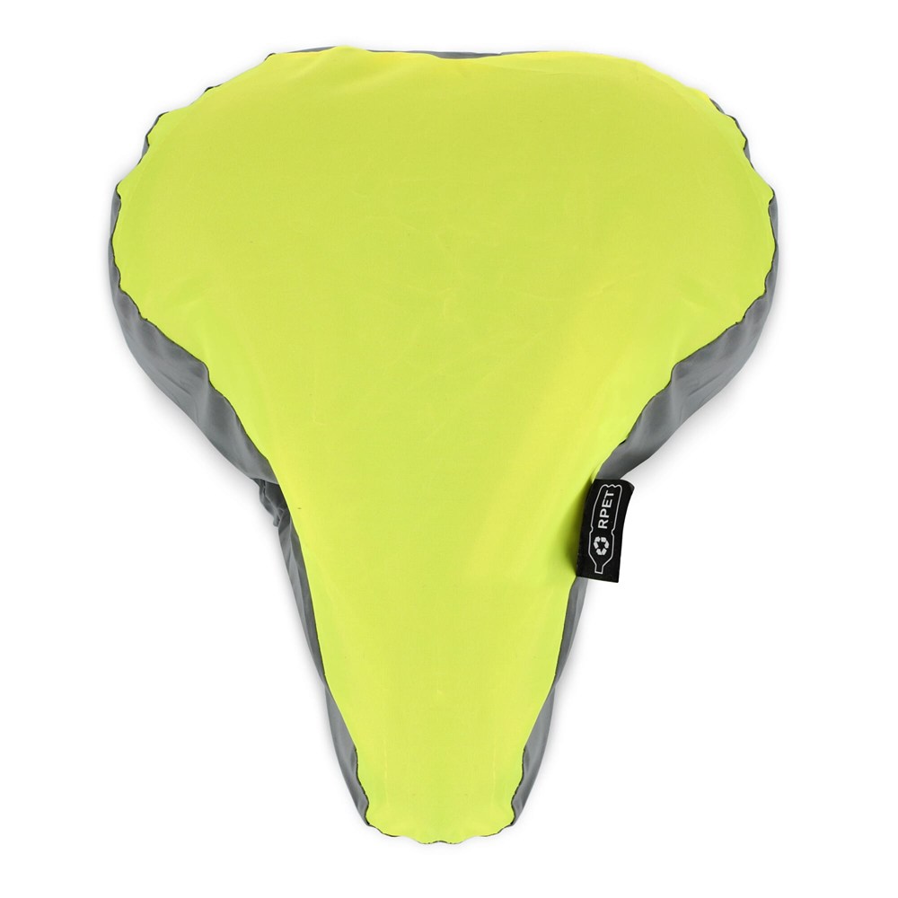 Het producttype is een reflecterende zadelhoes. Het materiaal is R-PET, gerecycled polyethyleentereftalaat. De zadelhoes is uitgerust met een reflecterend element. Dit verhoogt de zichtbaarheid bij schemering. De hoes is waterafstotend. Hij beschermt het zadel tegen vocht. De kleur van de hoes is Geel. De hoes is geschikt voor variabele productafmetingen van standaardzadels. Hij wordt stevig op zijn plaats gehouden door een elastische rand.