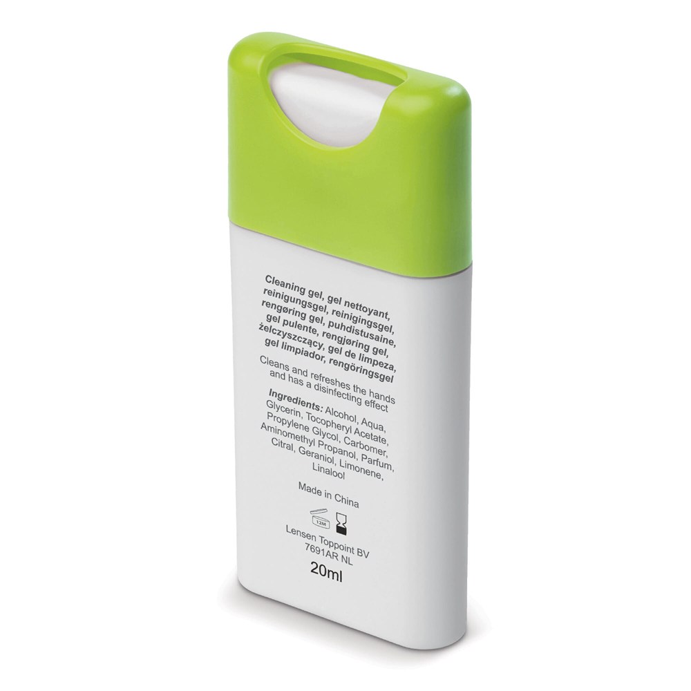 Dit is de reinigende handspray in een compact formaat van 20 ml. De formule is op basis van alcohol en bevat 62% reinigende bestanddelen. Deze handspray is ontworpen als een praktisch promotieartikel voor jouw merk. Je kunt het product eenvoudig meenemen in je zak of tas. De handspray is verkrijgbaar in de kleuren Wit, Zwart, Rood, Oranje, Blauw, en Roze.