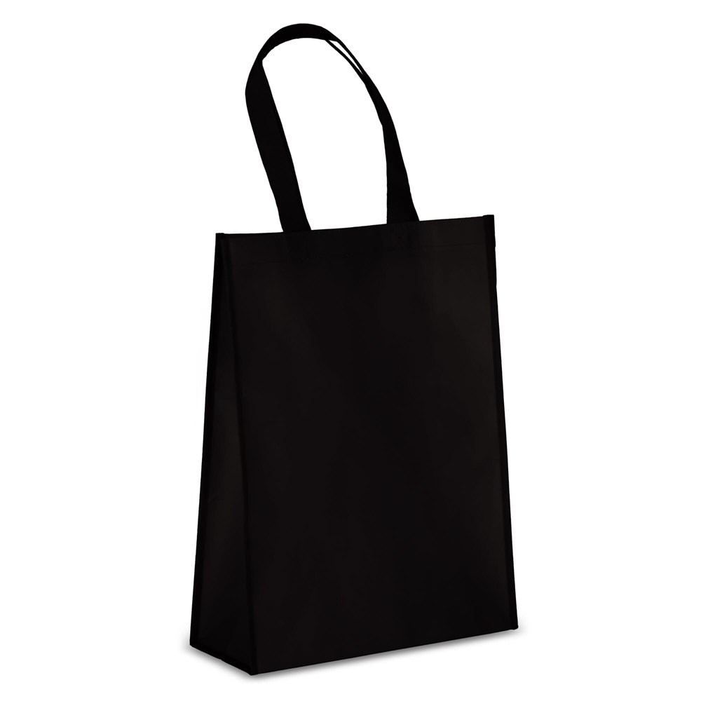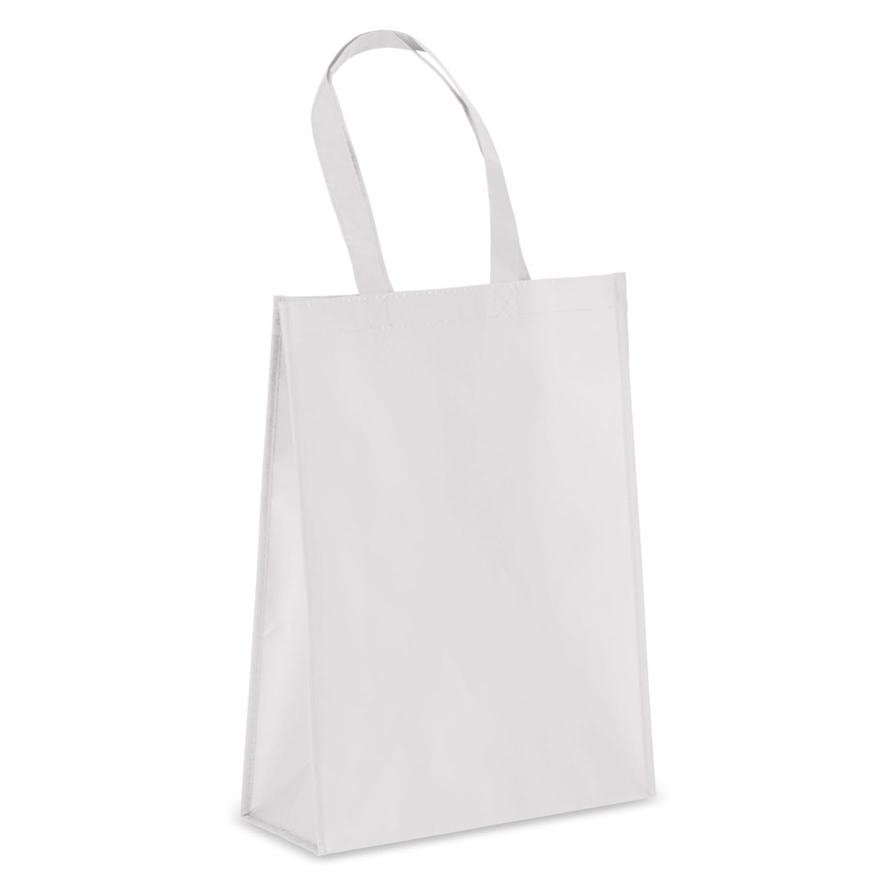 Het non-woven materiaal is 70% gerecycled (R-PET). De stofkwaliteit is 105 gram per vierkante meter (g/m²). De tas is voorzien van stevige, gestikte handvatten. De buitenzijde is gelamineerd voor een glanzende afwerking en duurzaamheid. De afmetingen van de tas zijn 30 centimeter breed, 12 centimeter diep en 40 centimeter hoog. De draagtas is leverbaar in onder andere Zwart, Oranje en Lichtgroen.