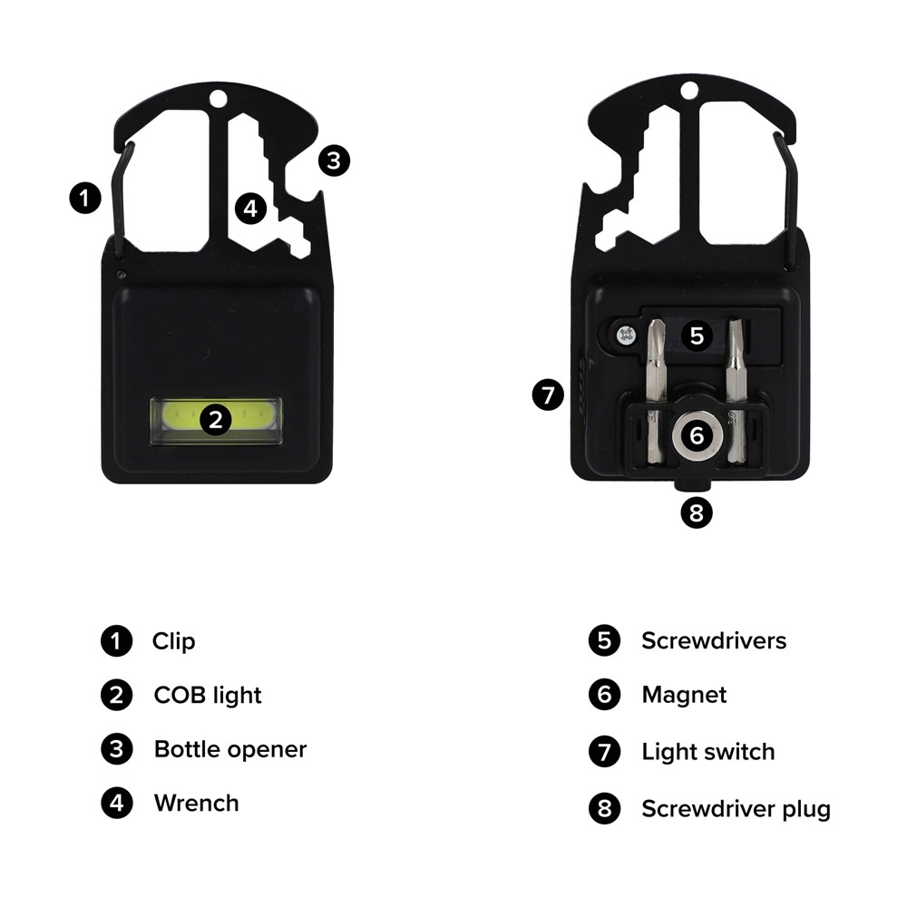 Dit compacte multigereedschap is ontworpen voor maximale promotie. Het is ideaal voor zakelijke klanten, verenigingen en evenementen. Je klemt de tool gemakkelijk aan je tas of riemlus via de geïntegreerde clip. De magneet maakt handsfree gebruik van de COB-lamp mogelijk. Bevestig het multigereedschap direct aan elk stalen oppervlak. Gebruik deze tool als praktische giveaway die dagelijks van pas komt.