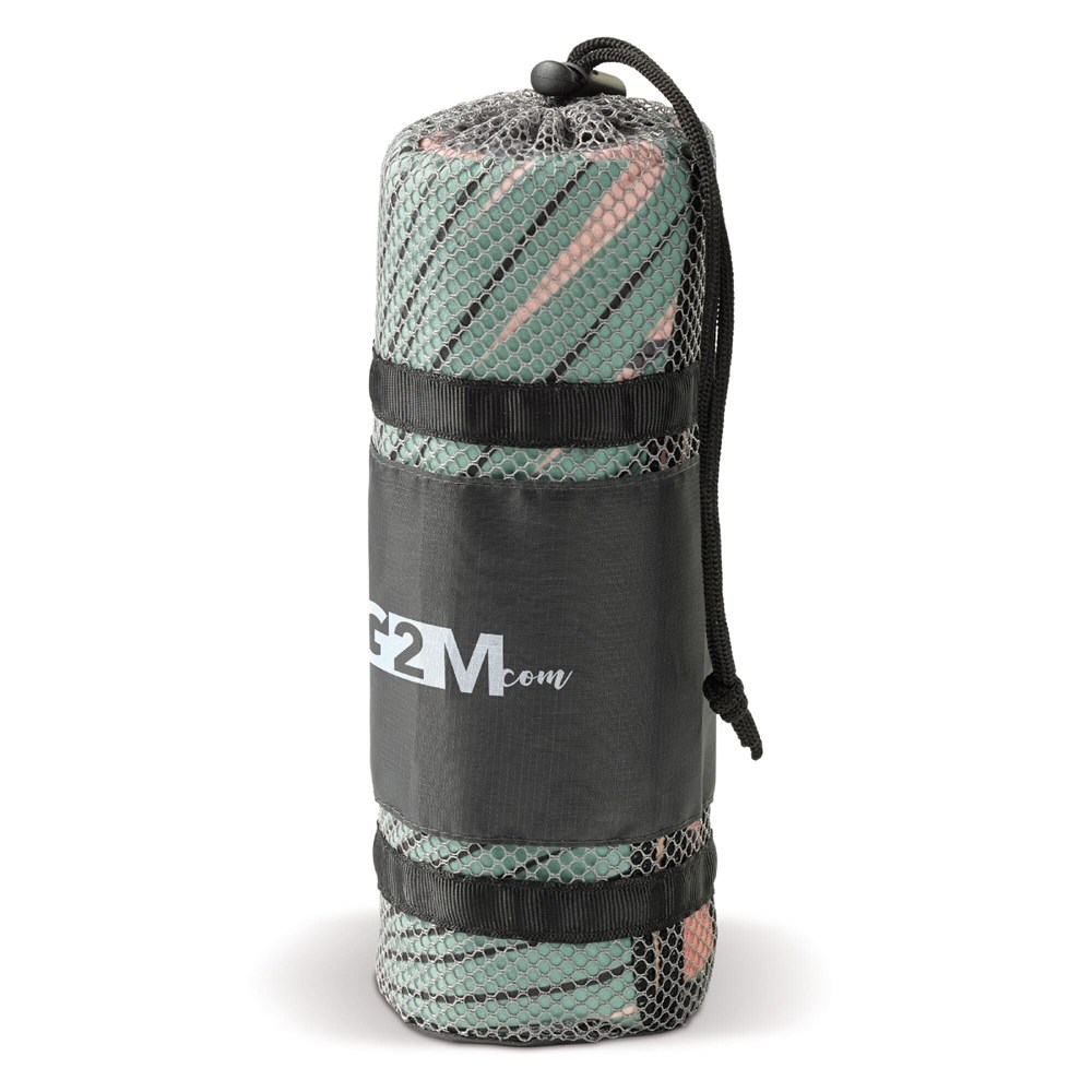 De handdoek is vervaardigd uit microfiber van hoge kwaliteit. Het materiaal is zeer licht en sneldrogend. De afmeting van de handdoek is 1000 x 1800 mm. Het materiaal heeft een dichtheid van 200 g/m². Full-colour bedrukking op maat is mogelijk. De handdoek wordt geleverd inclusief een compact draagtasje.