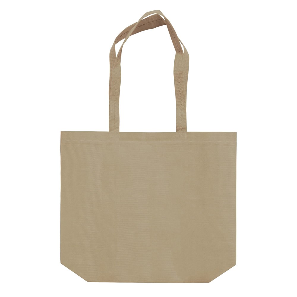 Dit is de Schoudertas R-PET 100g/m². De tas is vervaardigd uit gerecycled PET-materiaal (R-PET). Voor de productie van één tas zijn vier gerecyclede PET-flessen hergebruikt. Met deze aankoop draag je direct bij aan het verminderen van plastic afval. Het model is voorzien van een extra brede bodem en zijvlakken. Hierdoor biedt deze Schoudertas R-PET een groter volume en meer stabiliteit.