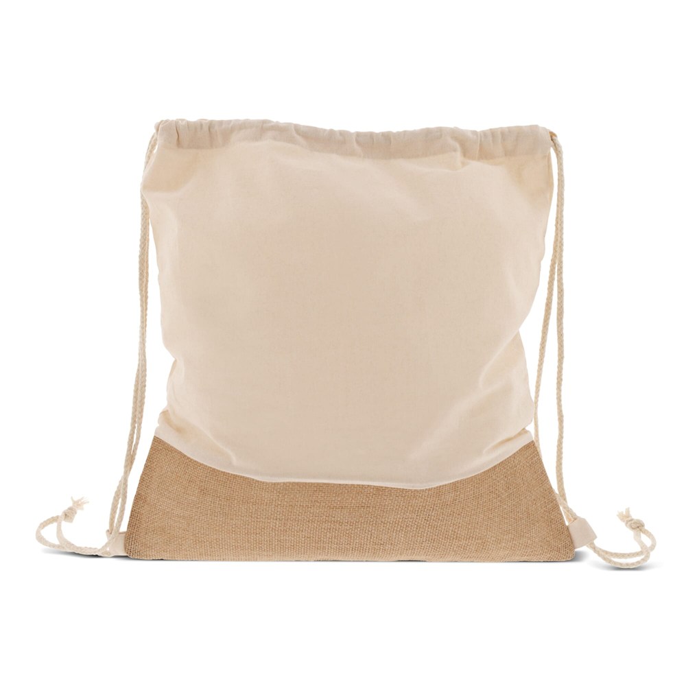 De buitenkant van de rugzak bestaat uit Jute. De trekkoorden zijn gemaakt van sterk katoen. De koorden fungeren tegelijkertijd als sluiting en als schouderbanden. Dit zorgt voor een efficiënt ontwerp. De afmeting is 38 x 41 cm. Dit artikel is een lichtgewicht promotieproduct.
