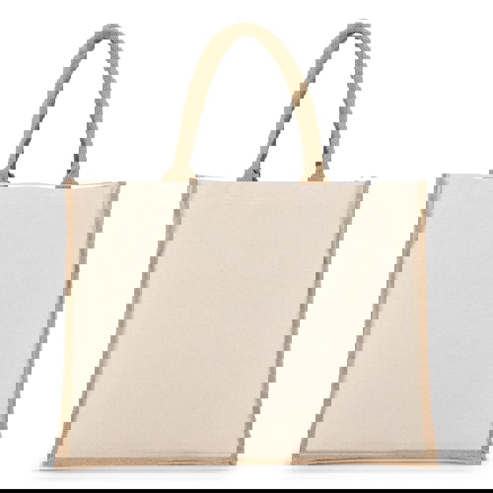 De afmetingen van de Jute-Katoen Tote zijn 42,5 x 19 x 32 cm. De tas heeft een materiaalgewicht van 320 g/m². De voor- en achterpanelen zijn uitgevoerd in natuurlijke katoenen canvas. De zijkanten en de bodem van de Tote zijn gemaakt van jute. De handvatten zijn gemaakt van kleur-gecoördineerd katoen. De Tote is OEKO-TEX® gecertificeerd.
