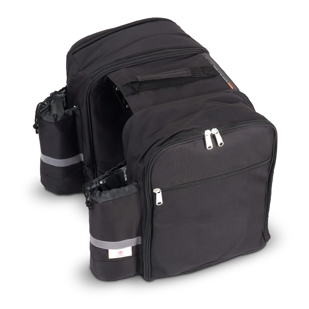 De Dubbele Picknick Fietstas is uitgevoerd in de kleur Zwart. De tas bevat een uitgebreide set met bestek, kopjes, bordjes, een snijplank en een kurkentrekker voor vier personen. Eén vak is een zeer ruim koelvak. Dit koelvak is voorzien van hoogwaardig isolatiemateriaal. De tas heeft geïsoleerde flessenhouders. Deze houders zijn voorzien van reflecterend materiaal. Dit zorgt voor extra zichtbaarheid in het donker. De montage geschiedt middels universele fietshaken.