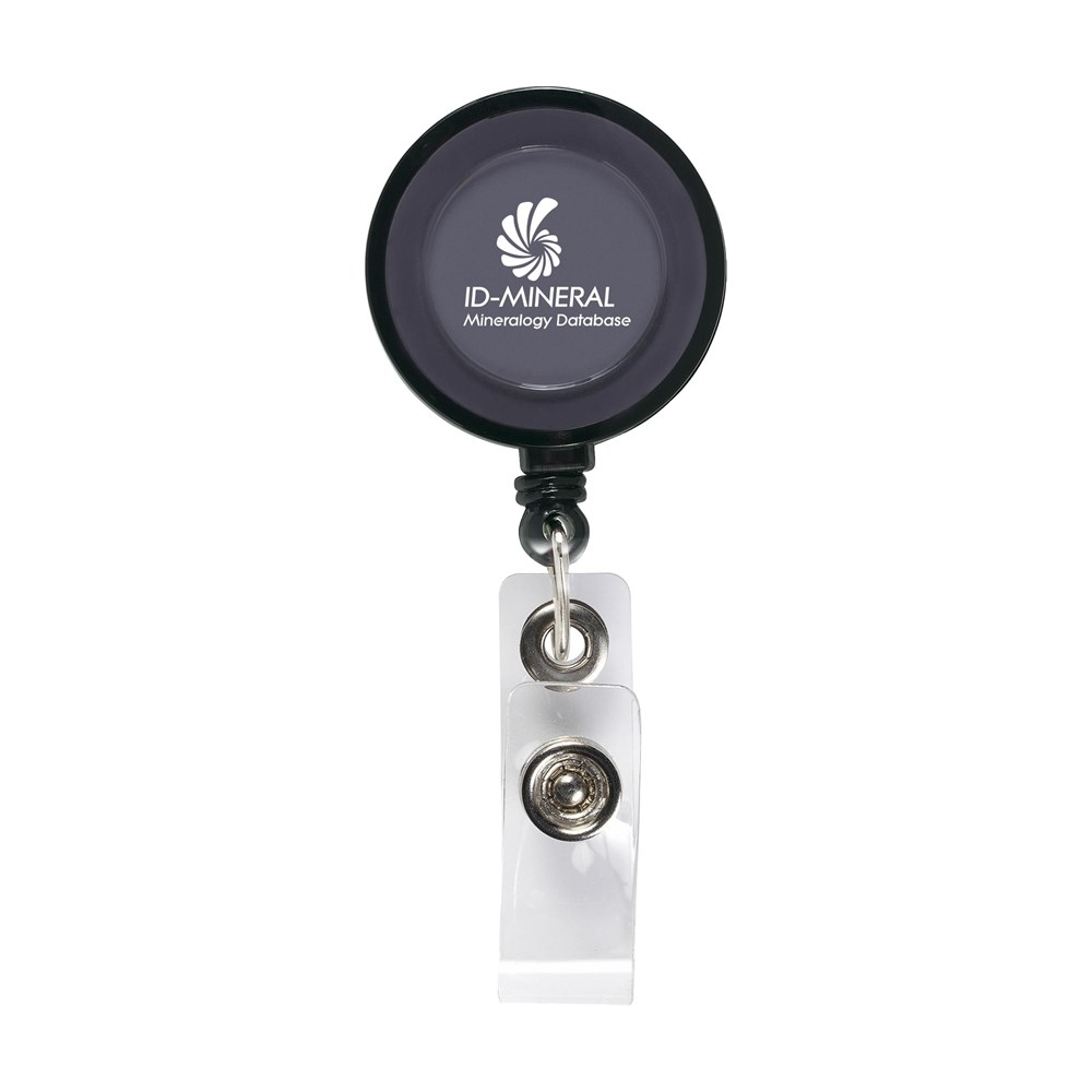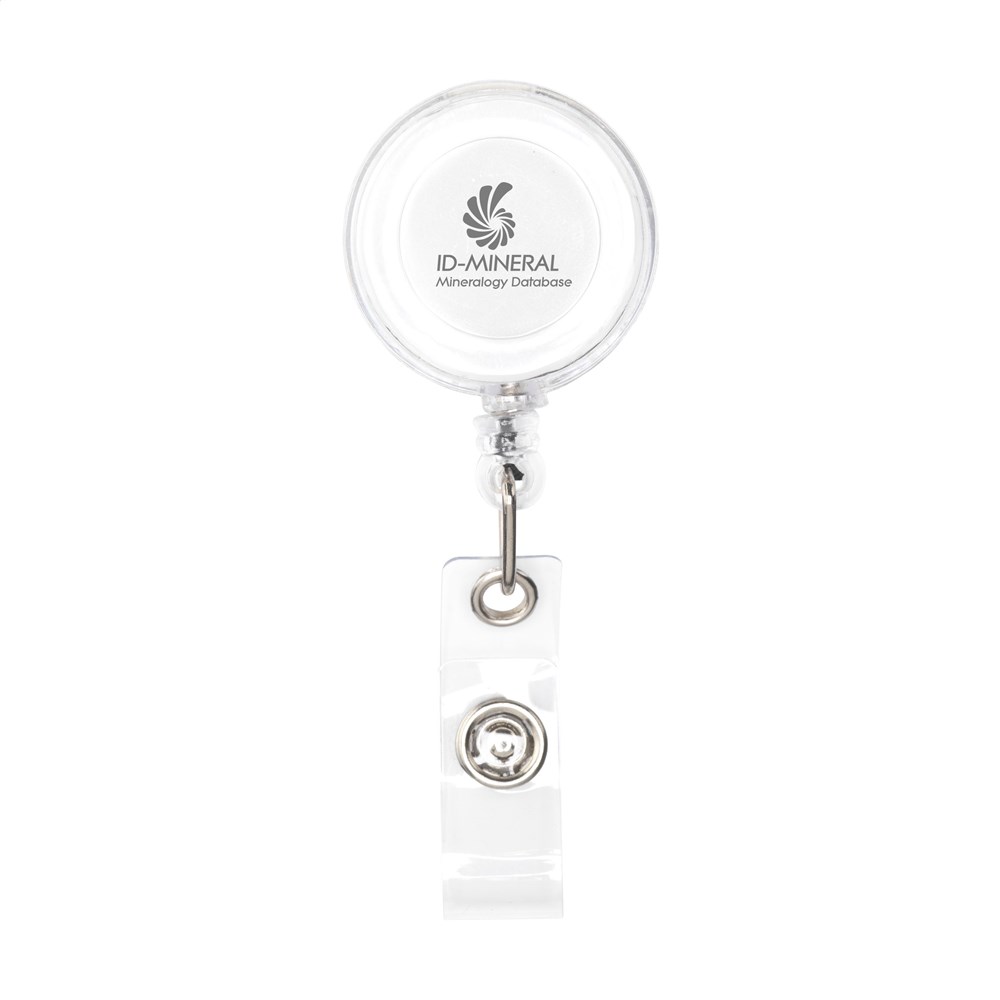 De badgehouder is gemaakt van kunststof en metaal. Het nylon koord rolt na gebruik automatisch terug in de behuizing. Aan de achterzijde bevindt zich een metalen clip voor bevestiging aan een riem of broekzak. Het product is leverbaar in de kleuren wit, transparant-wit, transparant rood, transparant blauw en transparant zwart.