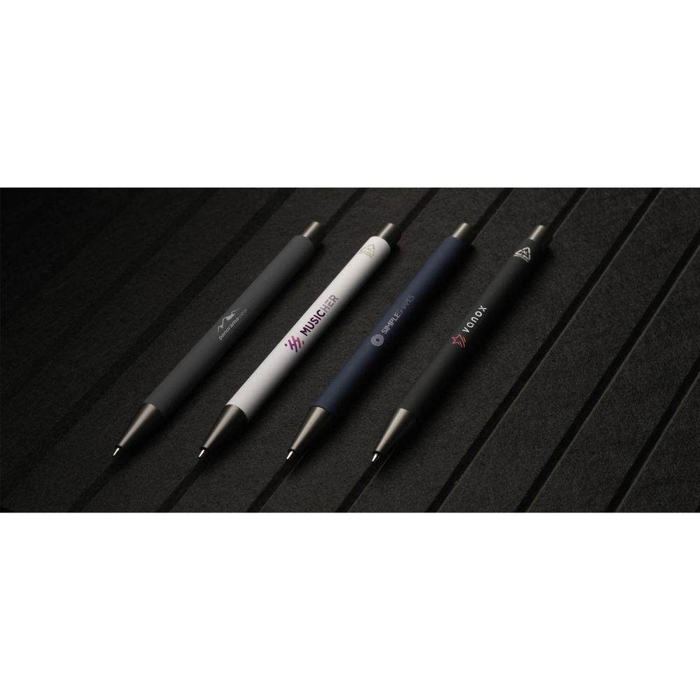 Het product betreft een blauwschrijvende balpen. De houder is vervaardigd uit 100% GRS-gecertificeerd gerecycled aluminium. De totale percentage gerecycled materiaal in dit product is 81%. De pen heeft een soft touch afwerking. Dit verbetert de haptische ervaring. Het is een variabel product, leverbaar in meerdere kleuren. Het eenvoudige design zonder clip geeft de pen een moderne uitstraling.
