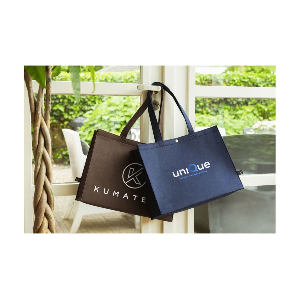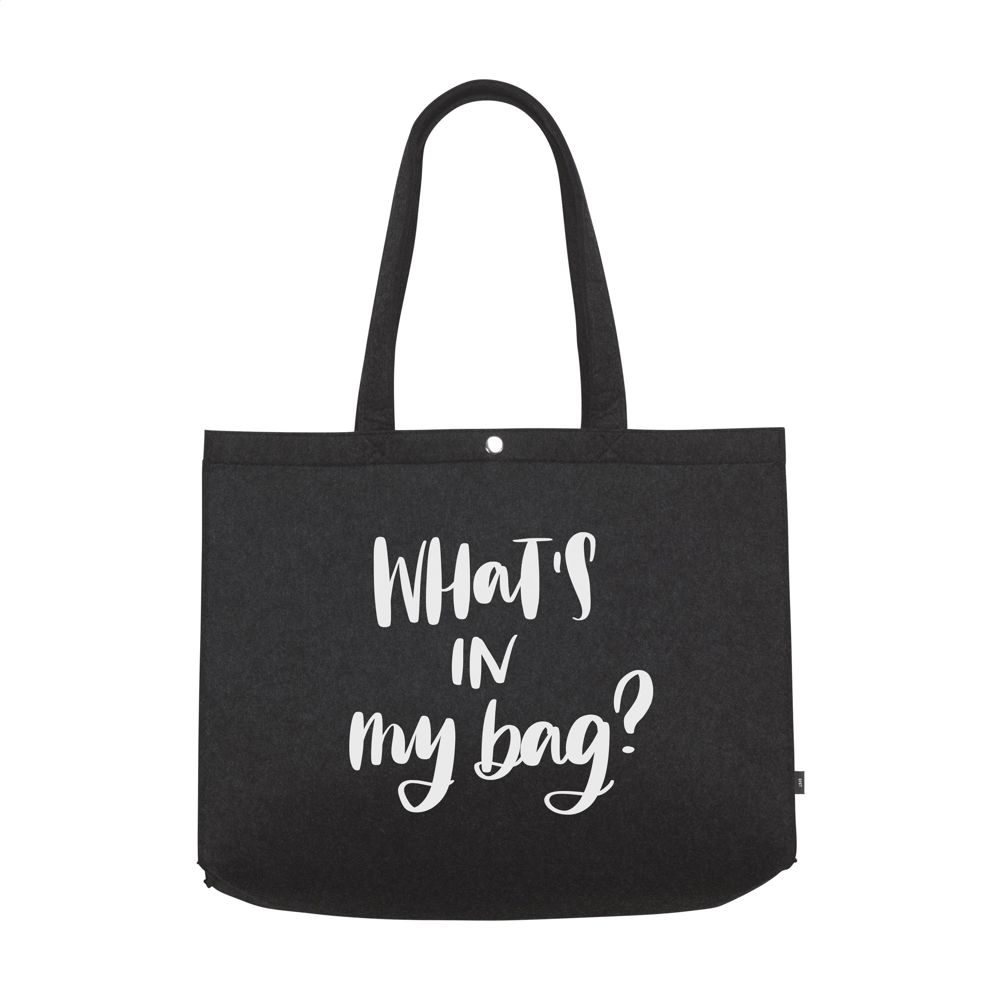 Het basismateriaal is duurzaam GRS RPET vilt. De tas heeft een draagcapaciteit van circa 20 liter. De sluiting bestaat uit een metalen drukknoop. De lange hengsels zijn stevig uitgevoerd. Dit product is leverbaar in meerdere kleuren, waaronder Donkergrijs, Zwart, Bruin, Donkerblauw en Lichtgrijs. Het hoge percentage gerecycled materiaal benadrukt de duurzaamheid van de tas.