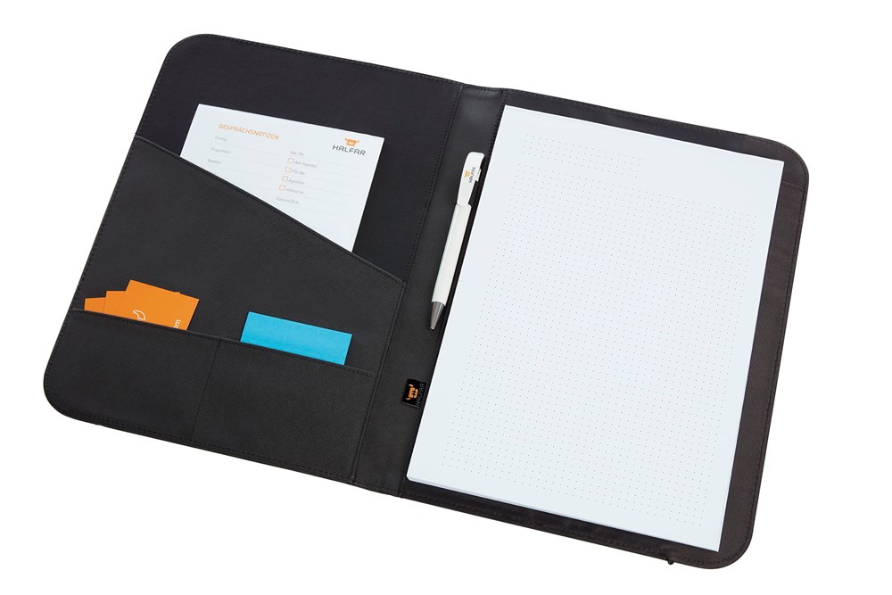 De Halfar conferentiemap bevat diverse organizer-elementen. De map heeft een vlak insteekvak voor losse papieren. Er is een rubberen lus aanwezig om een balpen in te steken. De conferentiemap wordt geleverd inclusief een schrijfblok. Het geheel is afsluitbaar met een rubberen band. De afmetingen zijn geschikt voor A4-documenten. De map is beschikbaar als variabel product.