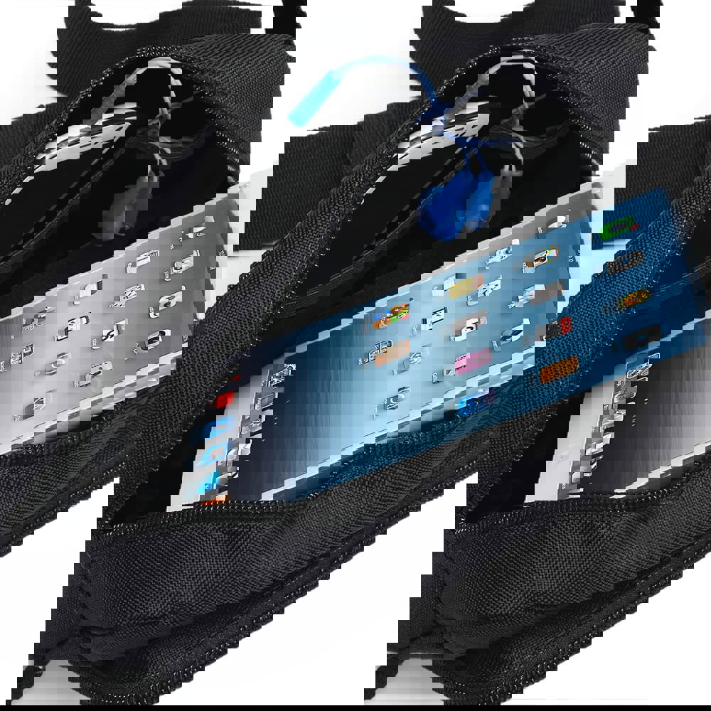 Het heuptasje is vervaardigd uit robuust 600D polyester. De heupriem is volledig aanpasbaar aan de gebruiker. Er is een speciale ring geïntegreerd voor de kabeltjes van een headset. Binnenin het heuptasje bevindt zich een handige mesh binnenzak. Voor extra veiligheid heeft het heuptasje een achterzak die sluit met een rits. Er is ook een sluithaak aanwezig voor het veilig opbergen van sleutels.