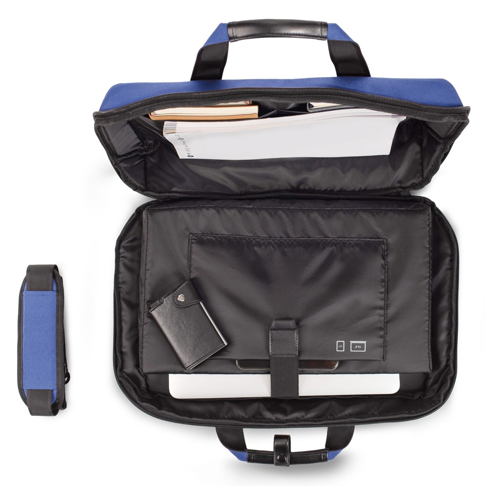 Deze R-PET Laptoptas is gericht op zakelijke klanten, verenigingen en evenementen. Je zet de tas in als representatief relatiegeschenk. De laptoptas is uitstekend promotiemateriaal voor beurzen en congressen. Door de ingebouwde trolleyband bevestig je de tas eenvoudig aan een koffer. Dit maakt de tas ook ideaal voor zakenreizen.