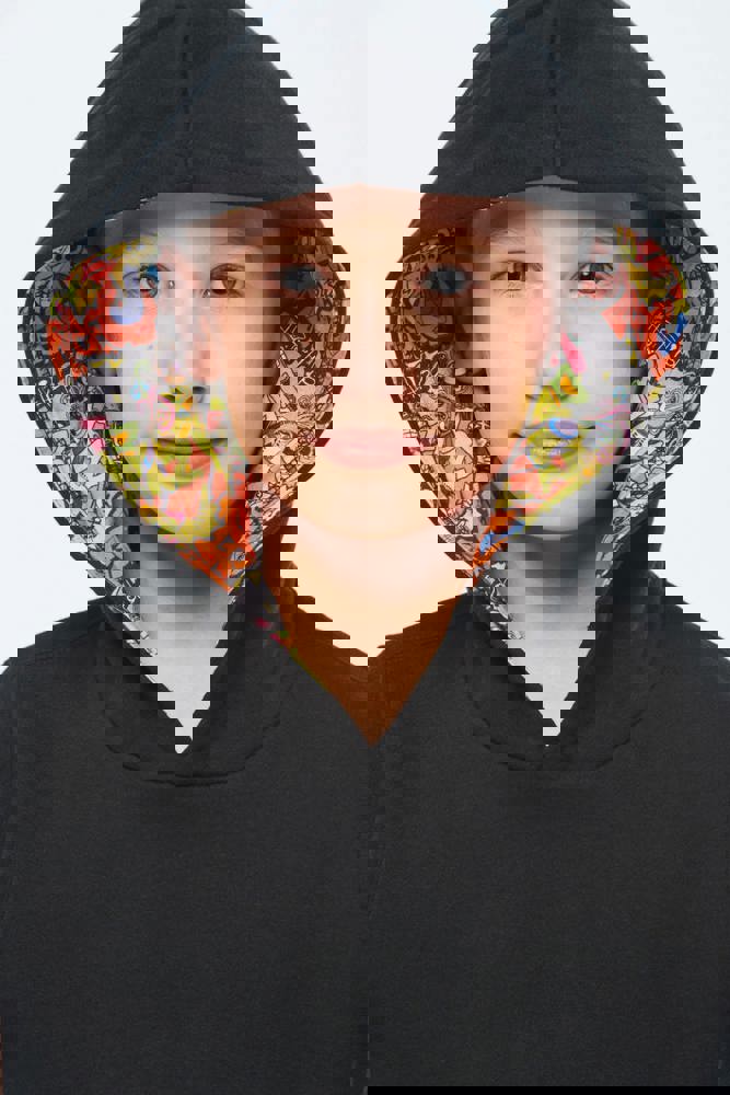 De kindersweater is vervaardigd uit een mix van 80% gekamd katoen en 20% polyester. De binnenzijde bestaat uit zacht geborsteld fleece van 3 draden. Dit zorgt voor een hoog draagcomfort en warmte. De sweater heeft een rechte pasvorm en is voorzien van ruime kangoeroezakken. De gevoerde capuchon heeft een themastof in bedrukt jerseykatoen, wat zorgt voor het contrasterende motief. De afwerkingen aan de mouwuiteinden en de boord zijn van 1x1 ribboord.