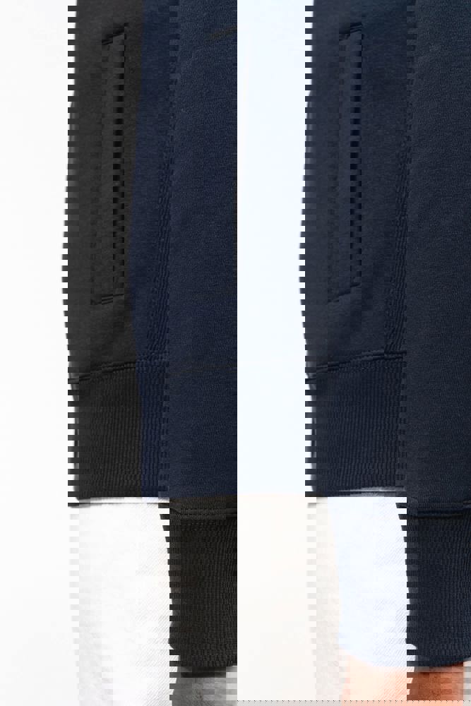 De stof bestaat uit 80% gekamd katoen en 20% polyester. Dit is een Low Shrunkage Fleece, wat krimp minimaliseert. Het fleece is aan de binnenkant geborsteld voor extra zachtheid. De sweater is voorgekrompen. De snit is recht dankzij verticale inzetstukken. Het artikel heeft een ritssluiting aan de voorzijde. Er zijn twee praktische voorzakken aanwezig. De sweater is beschikbaar in de kleuren Navy, Black en Oxford Grey. Je kiest uit maten variërend van S tot en met 3XL.