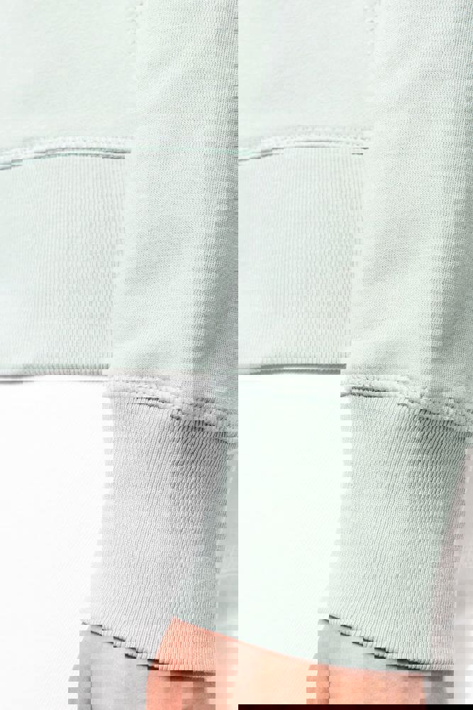Deze sweater heeft een modieuze snit. De hals is rond en afgewerkt met een V-opening. De mouwen zijn ingezet als raglanmouwen. Het materiaal bestaat uit 80% biologisch katoen en 20% polyester. Voor sommige kleuren is dit gerecycled polyester. De stof is French Terry. Dit is LST (Low Shrinkage Terry) voor minimale krimp. De nektape in twill aan de binnenzijde verhoogt de draagbaarheid. De ribboorden bij de hals, mouwen en onderkant zorgen voor een goede pasvorm.