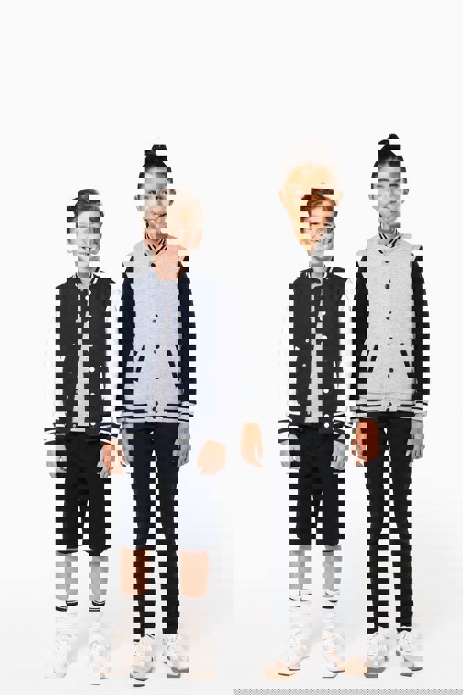 Dit is de K498 Kinder College Jacket. Het jack is een klassiek varsity-model. Het is ontworpen voor kinderen. De jas is gemaakt van een mix van katoen en polyester. De binnenkant heeft een geborsteld fleece. Dit zorgt voor een zachte en warme afwerking.