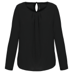 De K5003 damesblouse bestaat uit 100% polyester crêpe. Dit materiaal is licht en valt soepel. Het ontwerp omvat lange mouwen. De hals is rond en voorzien van een bies. Er zijn fronsjes aanwezig aan de voorkant bij de halsopening. De sluitingen aan de achterzijde en mouwen zijn discreet weggewerkt met een afgedekte knoop. De blouse is beschikbaar in meerdere maten en kleuren.