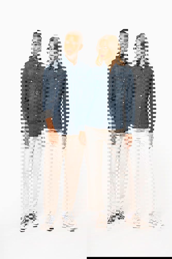 De denim blouse is geschikt voor bedrijfskleding en teamuniformiteit.