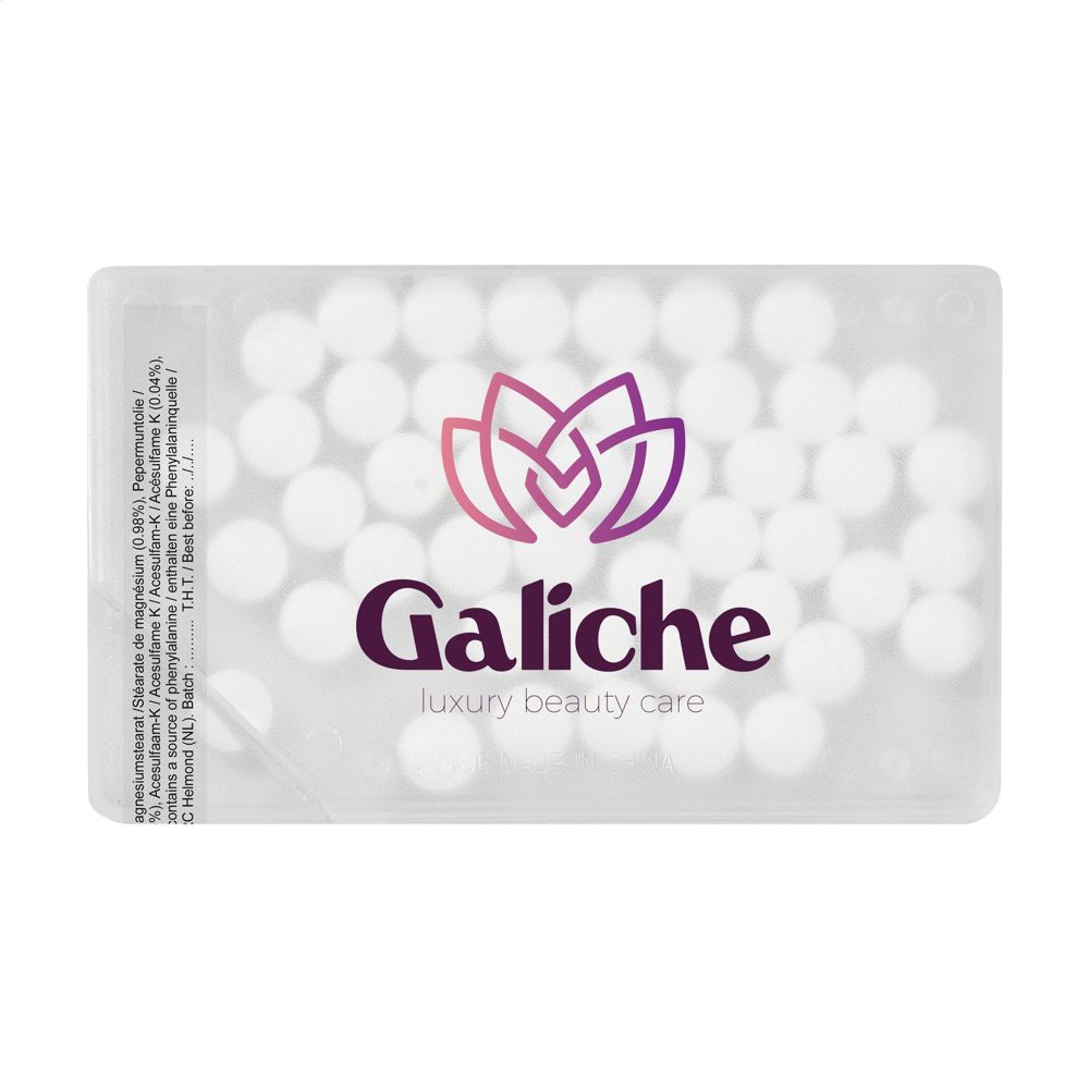 De dispenser bevat ongeveer 8 gram aan suikervrije pepermuntjes. Dit staat gelijk aan circa 50 stuks per verpakking. Het product is leverbaar in de kleuren wit, zwart, blauw en transparant. De vormgeving is gebaseerd op de standaard afmetingen van een creditcard.