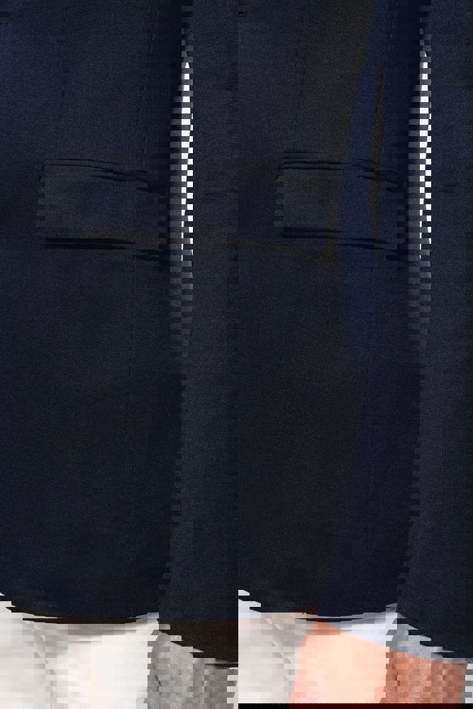 De blazer is uitgevoerd in een interlock tricot stof. De samenstelling voor Night Navy Heather is 80% polyester, 18% katoen en 2% elasthan. De Light Grey Heather bestaat uit 74% polyester, 24% viscose en 2% elasthan. Dit zorgt voor een lichte stretch en draagcomfort. Het model heeft twee knopen aan de voorzijde. Aan de voorkant zitten twee omzoomde zakken met klep. Er is een borstzak aanwezig. De blazer heeft twee binnenzakken met knoop en een speciale gsm-zak. De mouwen zijn afgewerkt met vier knopen. Twee splitten op de achterzijde verhogen de bewegingsvrijheid.
