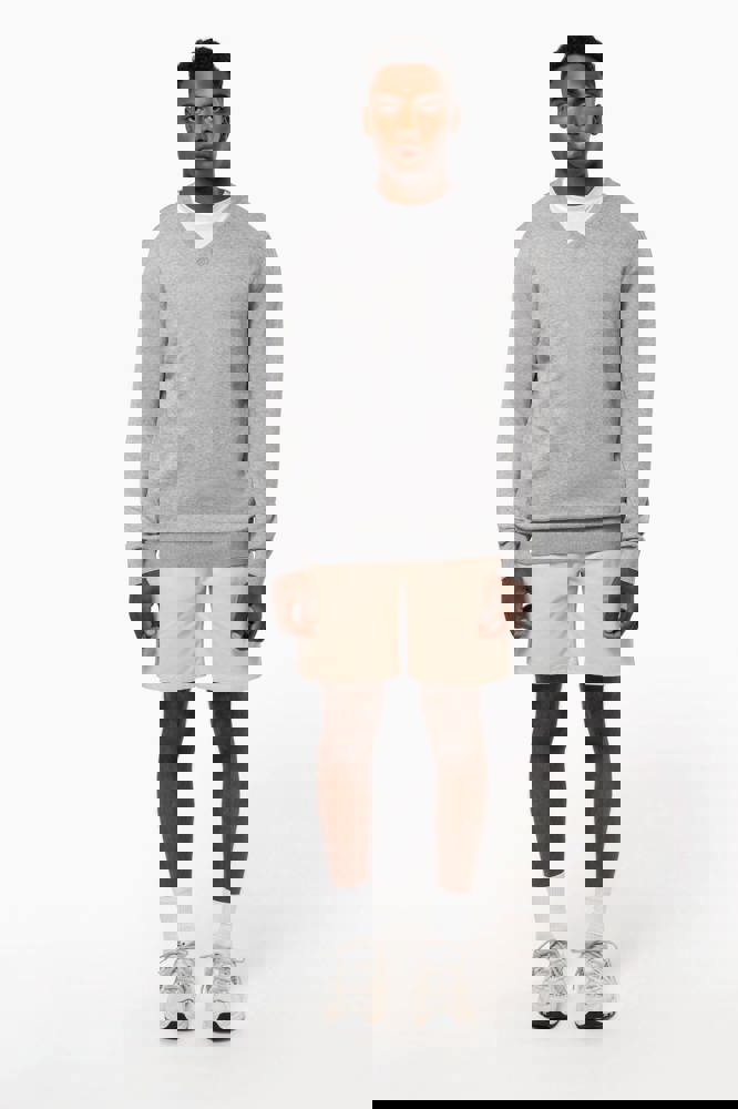 De trui bestaat uit een mix van 50% biologisch katoen en 50% gerecycled polyester. Dit gerecyclede materiaal is post-consumer. Het breiwerk is van de soort Fully Fashion met Gauge 12. De trui heeft ingezette mouwen en een rechte snit. De V-hals en de uiteinden zijn afgewerkt met een 1x1 ribboord. Aan de binnenzijde van de kraag zit een dun, contrasterend streepje van 3 mm. De trui is beschikbaar in meerdere maten en de kleuren Navy, Black en Light grey heather.