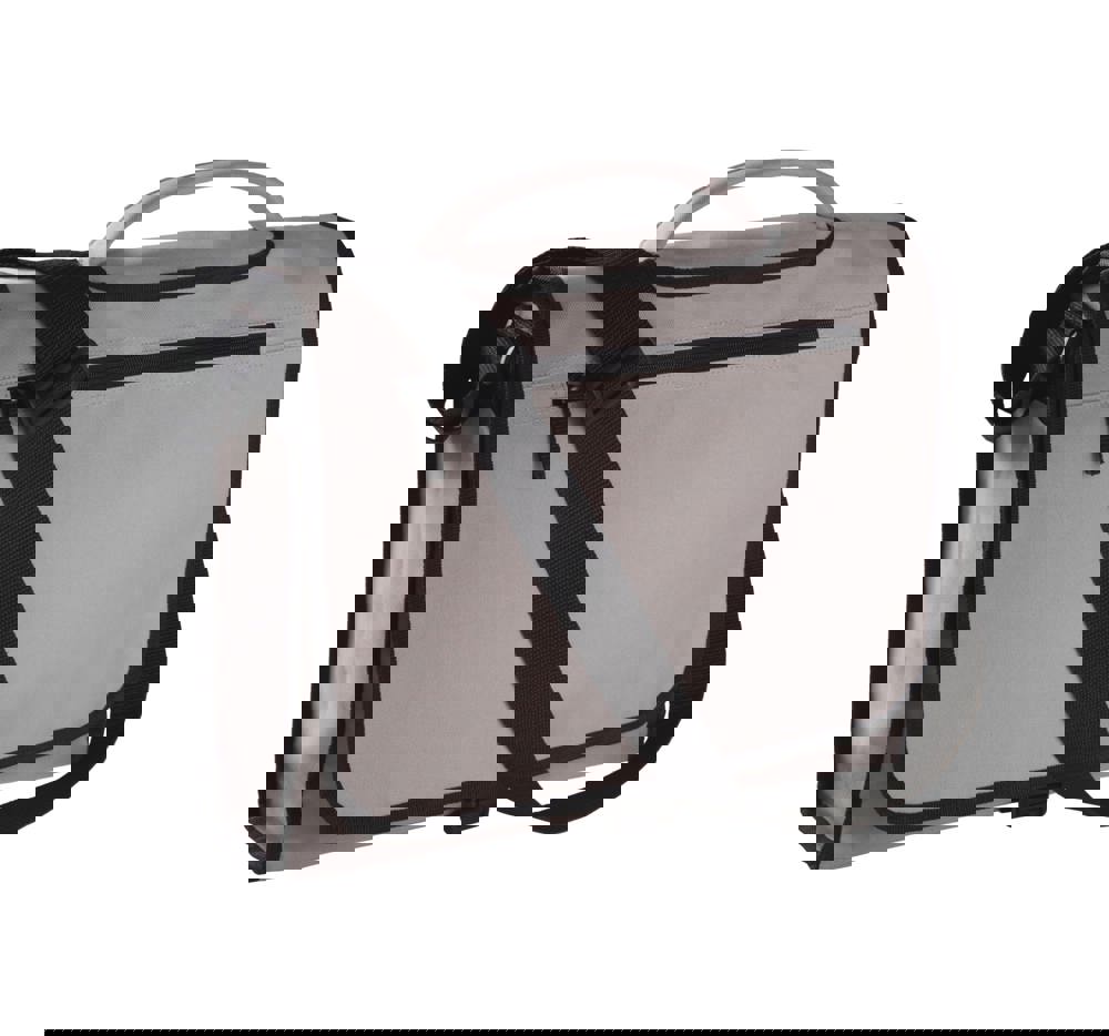 Het materiaal van de tas is 600D polyester. De tas is voorzien van een overslag. De overslag sluit met een stevige gesp. Aan de buitenzijde van de flap zit een vak met ritssluiting. Binnenin de tas vind je houders voor pennen en visitekaartjes. Er is een apart binnenvak voor extra organisatie. De schouderband is verstelbaar.