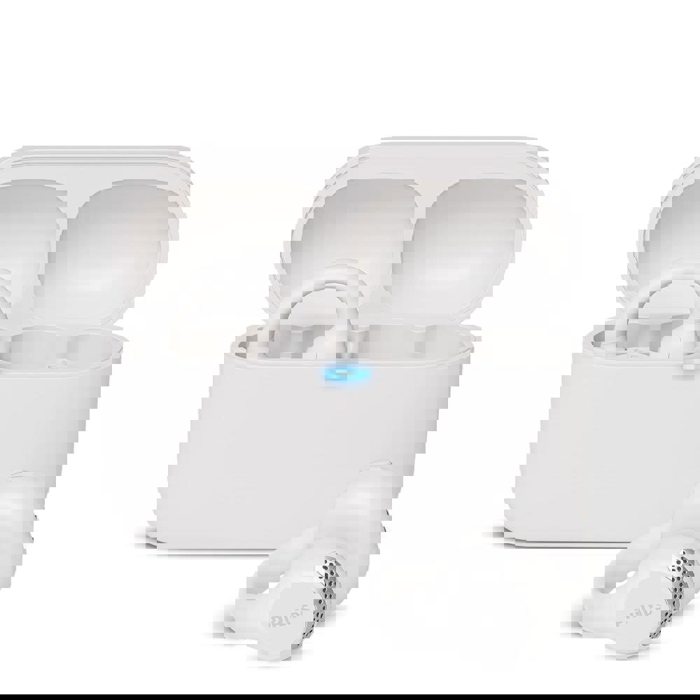 Dit zijn de Philips TAQ2000 Open-ear TWS Oordopjes. Het product is een set draadloze in-ear oordopjes. Ze zijn ontworpen met een open-ear design. Dit ontwerp zorgt ervoor dat je omgevingsgeluid blijft horen. De oordopjes zijn beschikbaar in de kleuren Wit en Zwart. Ze zijn uitermate geschikt voor effectief promotioneel gebruik.