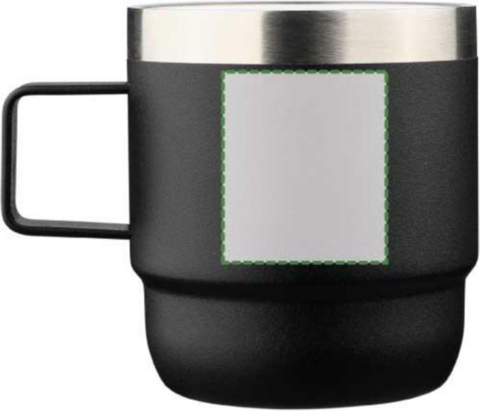 Dit model is dubbelwandig uitgevoerd. De binnenkant is van roestvrij staal 304. De buitenkant is gemaakt van roestvrij staal 201. De binnenzijde is behandeld met een keramische coating. Deze coating verbetert de hygiëne en voorkomt smaakoverdracht. De totale inhoud van de beker is 180 ml. Het artikel wordt geleverd met een handig handvat.