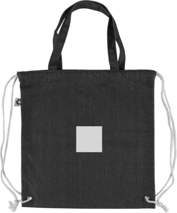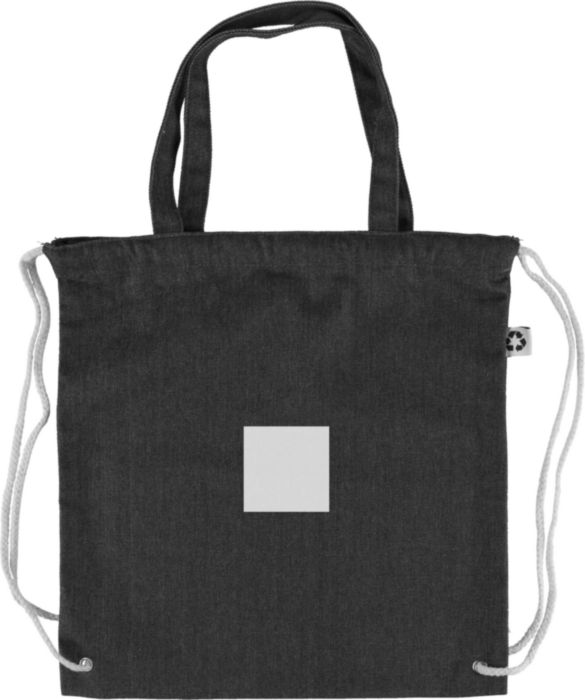 Dit is een lichtgewicht trekkoordrugtas van gerecycled denim.