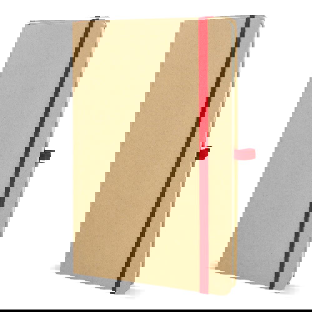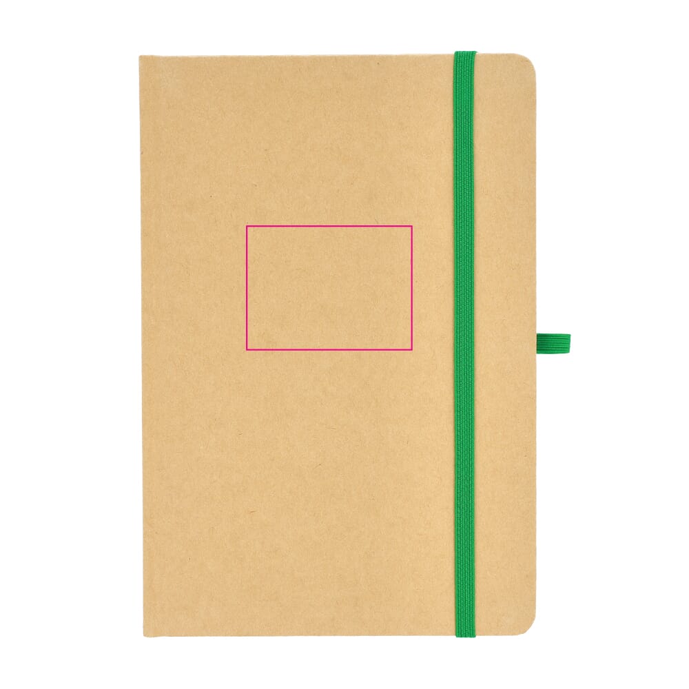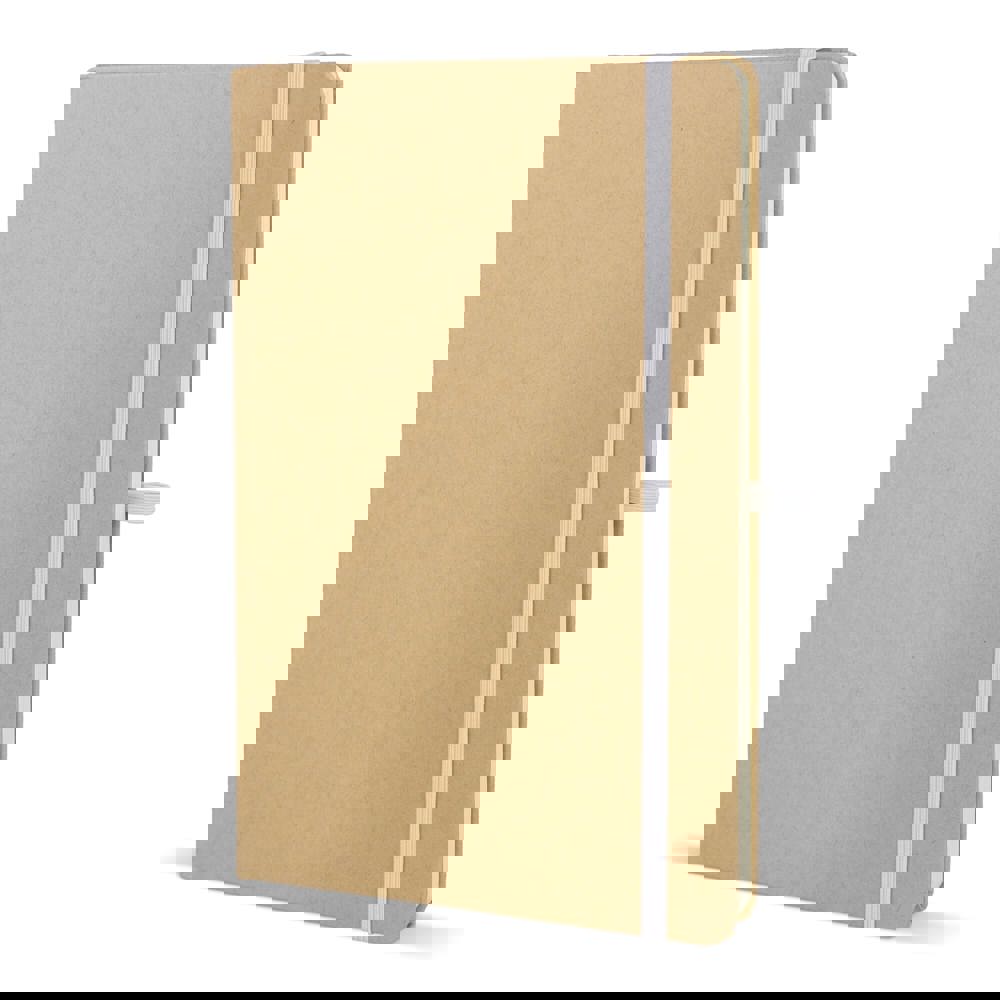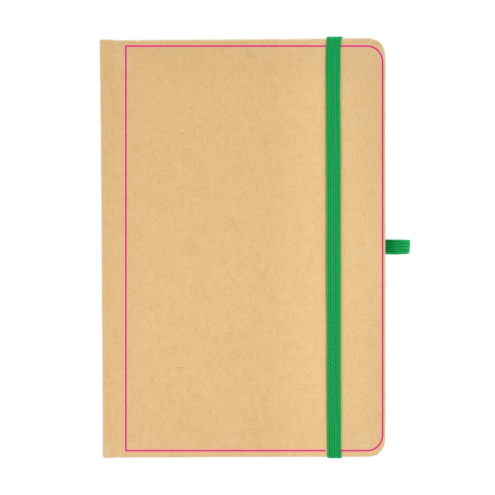 Dit is een notitieboek in het formaat A5. De omslag is gemaakt van stevig kraftpapier. Het notitieboek bevat 80 gelinieerde pagina’s. De pagina’s zijn crèmekleurig en bestaan uit gerecycled papier. Het notitieboek is voorzien van een leeslint. Een gekleurde elastische sluiting houdt het notitieboek dicht. Er is ook een pennenlus aanwezig. De hoeken zijn voor de veiligheid afgerond. Je kiest uit de kleuren Wit, Zwart, Rood, Oranje, Blauw en Groen.