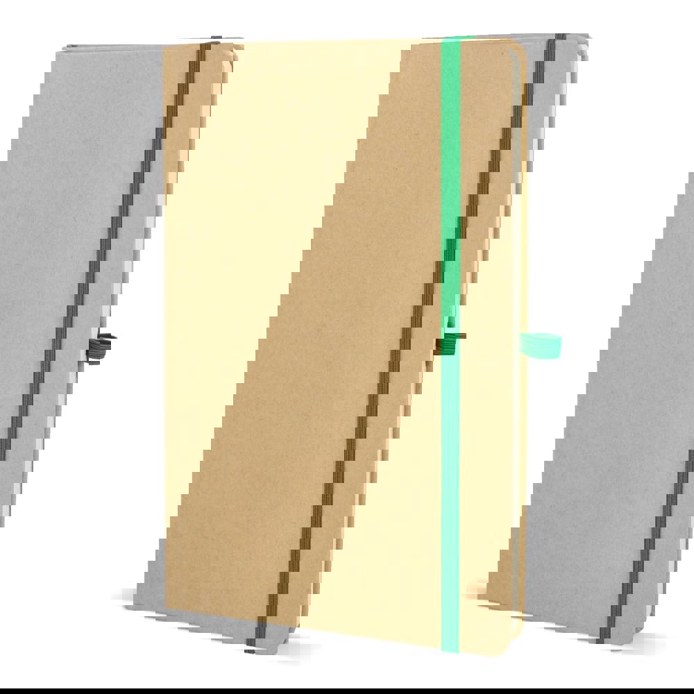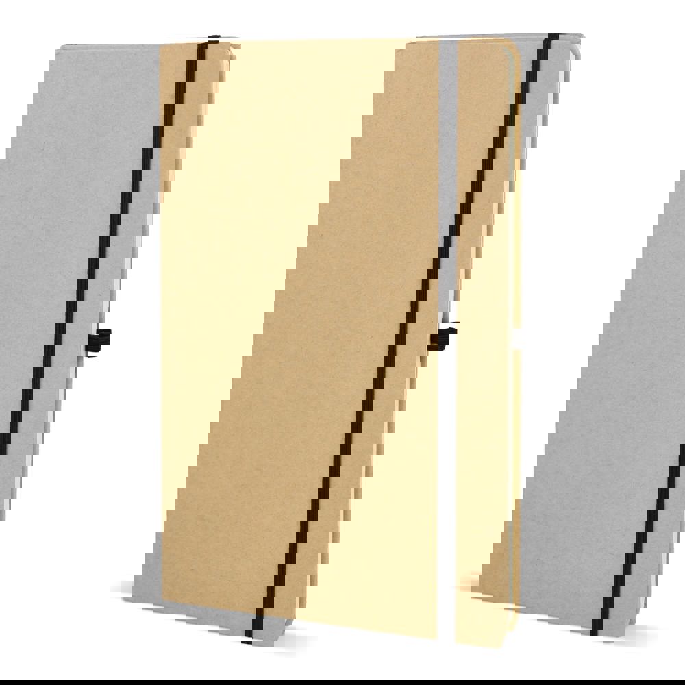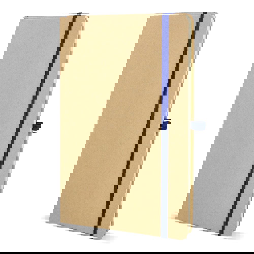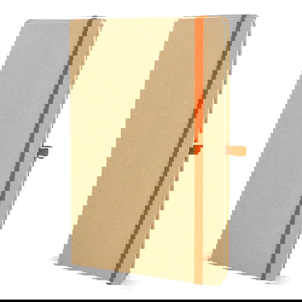 Dit is een notitieboek in het formaat A5. De omslag is gemaakt van stevig kraftpapier. Het notitieboek bevat 80 gelinieerde pagina’s. De pagina’s zijn crèmekleurig en bestaan uit gerecycled papier. Het notitieboek is voorzien van een leeslint. Een gekleurde elastische sluiting houdt het notitieboek dicht. Er is ook een pennenlus aanwezig. De hoeken zijn voor de veiligheid afgerond. Je kiest uit de kleuren Wit, Zwart, Rood, Oranje, Blauw en Groen.