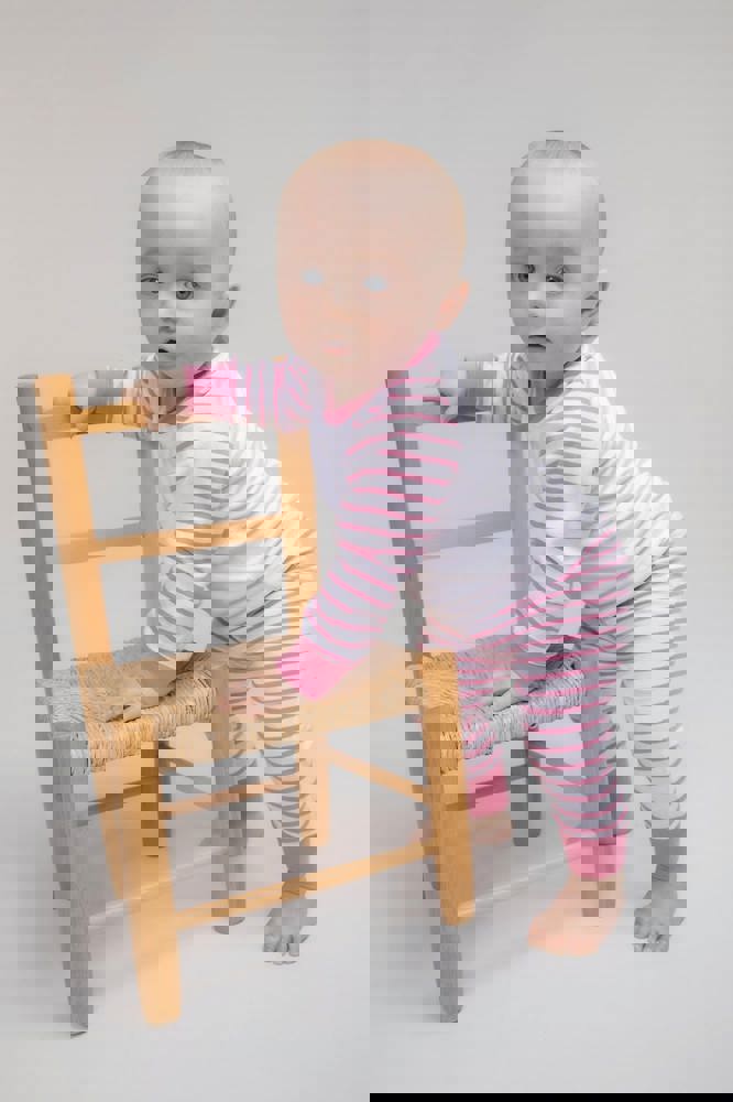Dit is de LW072 gestreepte pyjama voor baby’s en peuters. De pyjama is ontworpen als merchandise of relatiegeschenk. Het is een tweedelig kledingstuk met een gestreept design. Dit artikel combineert de zachtheid van jersey katoen met de bedrukkingsmogelijkheden van polyester.
