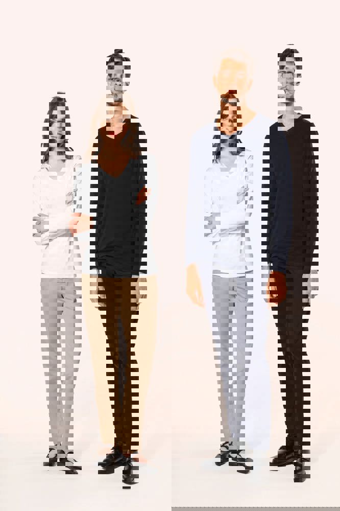 Het T-shirt is vervaardigd uit 100% gekamd Supima® katoen. Het materiaal is tricot met een fijne, zachte structuur. De V-hals is voorzien van ton-sur-ton nektape. De schoudernaad is verstevigd met een silicone bandje. De mouwuiteinden en de onderkant zijn afgewerkt. Dit gebeurt met een zoompje met dubbel stiksel. Het T-shirt heeft een lange mouw. Het is verkrijgbaar in de maten S, M, L, XL, XXL, 3XL en 4XL. De beschikbare kleuren zijn Black, White en Deep Navy.