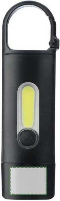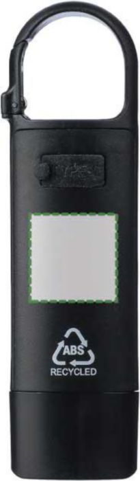Gerecyclede ABS mini-zaklamp met ingebouwde 200 mAh USB-oplaadbare batterij en karabijnhaak. Voorzien van een front COB-licht en zijkant COB-schijnwerper met drie lichtstanden. Inclusief USB-C oplaadkabel en gerecycled ABS-logo. Individueel verpakt in een bruine kartonnen doos.